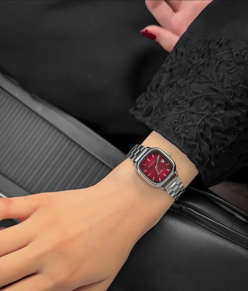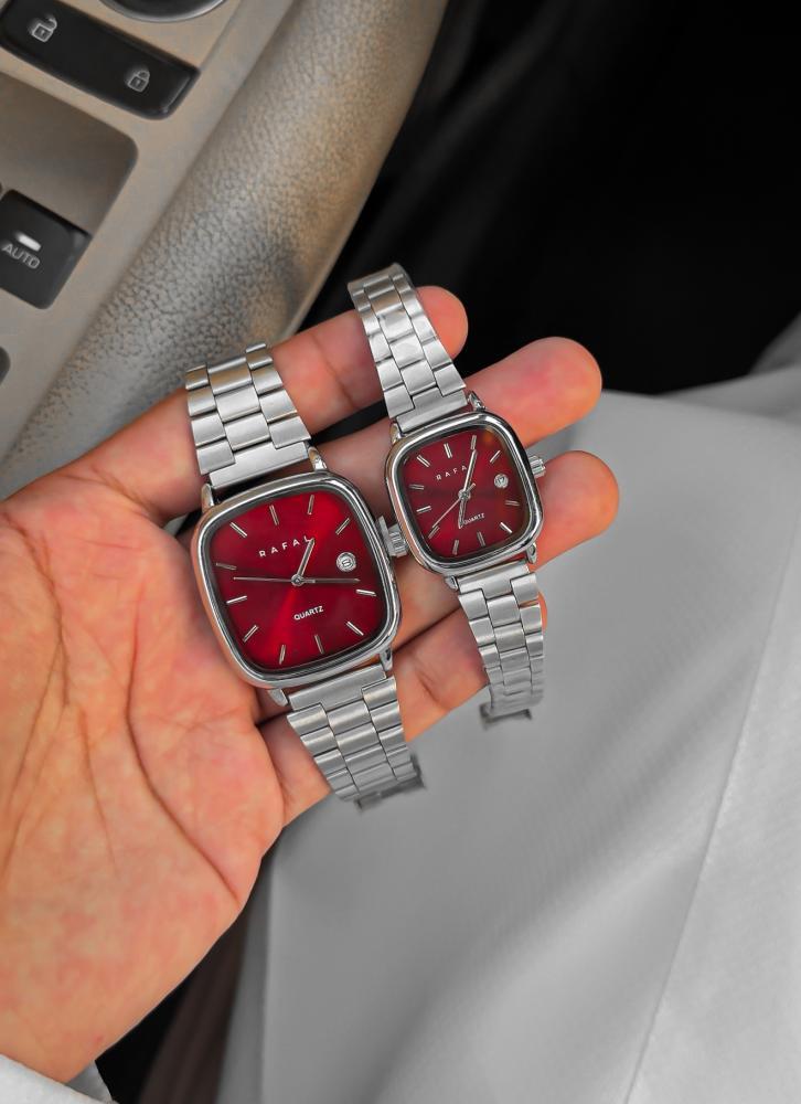 ساعات RAFAL فضي مع احمرساعة رجالية + ساعة نسائيةذات تصميم مميز وعصريمقاومة للماء بشكل سطحيتحكم بمقاس السير بشكل سلستوصلك في باكج مرتب ومناسب للإهداء