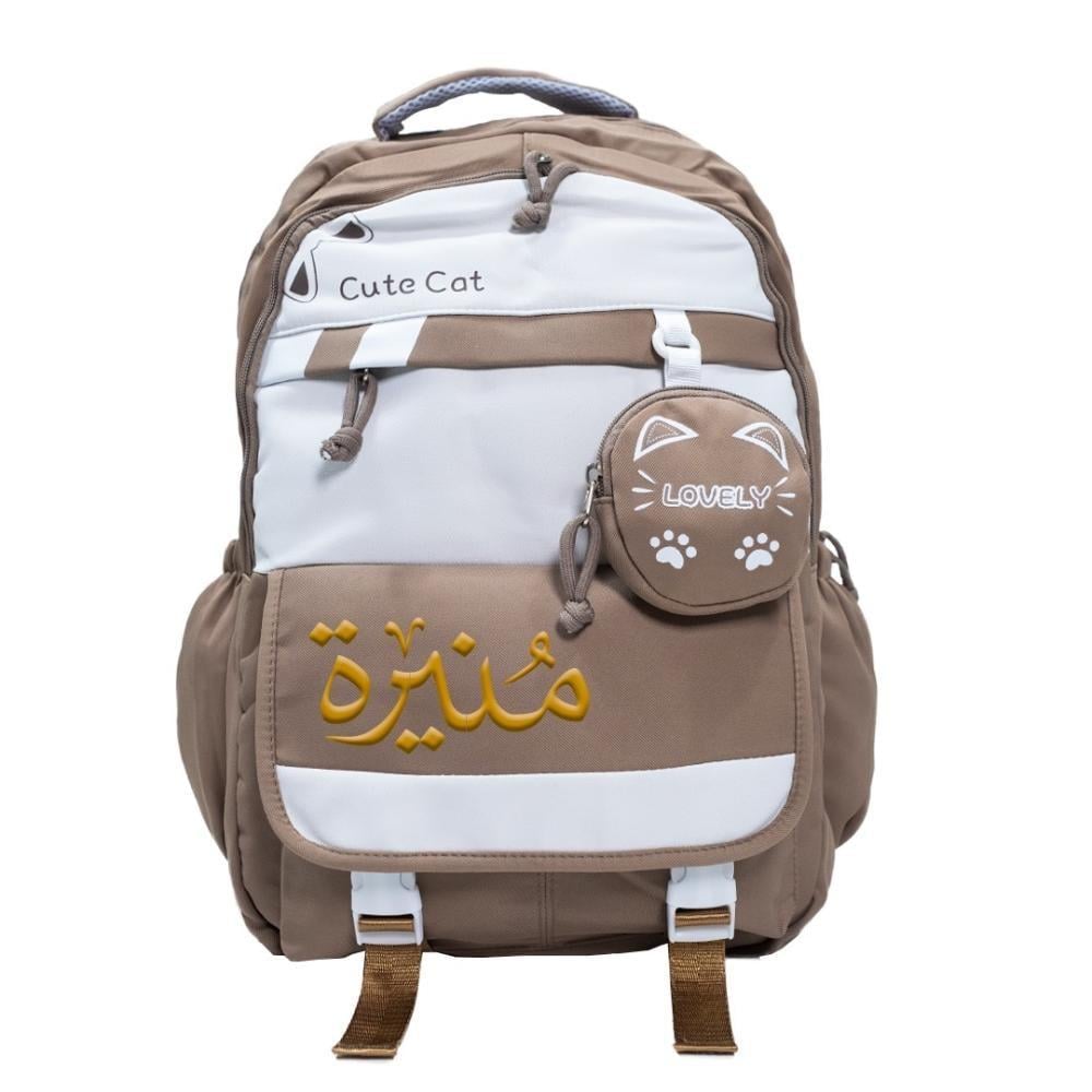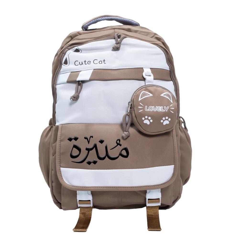 شنط ظهر بلونين متداخلين وتصميم كيوت يحمل عبارة Cute Cat" مع ميدالية دائرية مطبوع عليها شكل وجه قطة وكلمة "Lovely'التصميم مميزء فيه جيوب كثيرة وسهل التنسيق؛ ومثالي للمدرسة أو الجامعةء خصوصاً للبنات اللي يحبون ستايلcute but practical